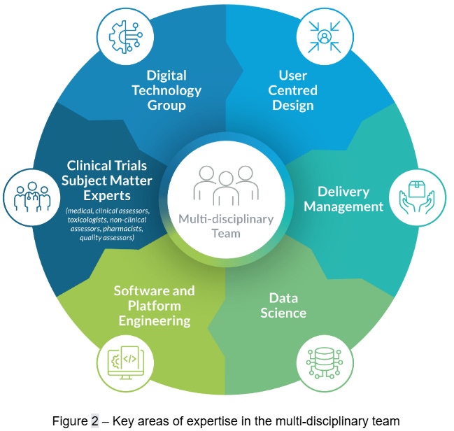To deliver targeted AI innovation in a responsible manner, we drew upon a diverse team of experts from both MHRA and Informed Solutions. The MHRA contributed clinical trial subject matter expertise, as well as software engineering and architecture capabilities from their Digital Technology Group (DTG). These capabilities were complemented by Informed Solutions’ strengths in software engineering, technical architecture, data science, delivery management and user-centred design skills. Together, this multi-disciplinary team (Figure 2) was able to rapidly identify and qualify opportunities for AI enablement and translate them into operational digital solutions.