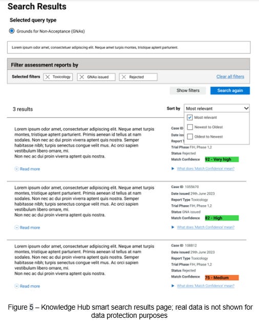 The Knowledge Hub gives assessors access to actionable historical context, strengthening the quality, consistency, and replicability of regulatory oversight. By improving how prior decisions can be surfaced and referenced, it supports more informed and efficient clinical trial assessments. In providing an intuitive and efficient interface (Figure 5) the service offers an entirely new pathway for assessors to access and understand historical information.