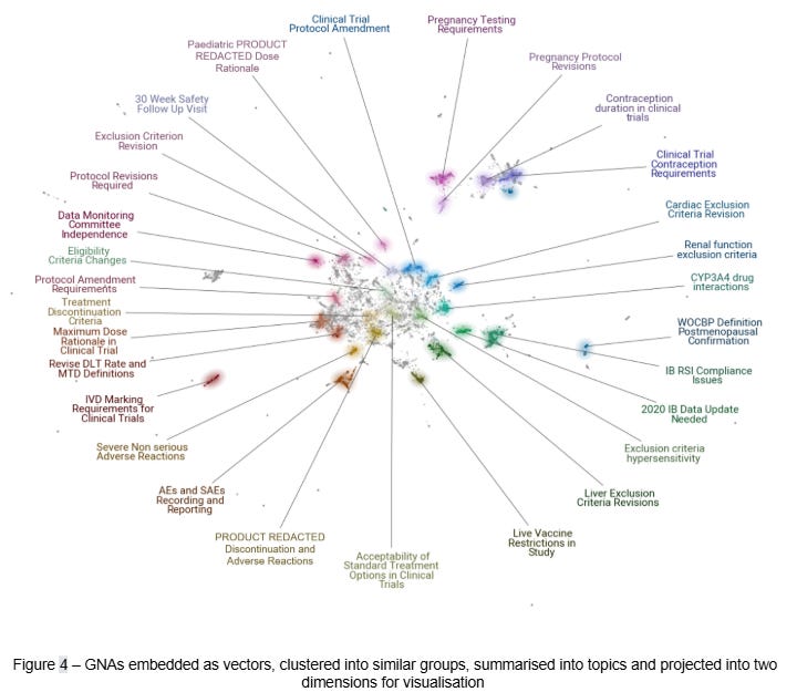 Building on our understanding of the user and business contexts, we shifted focus to technical exploration and the evaluation of suitable AI techniques. This included the use of text embeddings for topic modelling (Figure 4) and natural language processing methods to identify patterns in regulatory documents. Specifically, we used text embeddings to analyse GNAs across both structural and semantic dimensions. We also examined common CTA documents, including protocols, investigator brochures (IB), application forms, and good manufacturing practice (GMP) certificates. This analysis ultimately confirmed the suitability of existing data holdings to support process improvement and automation in live operations.
