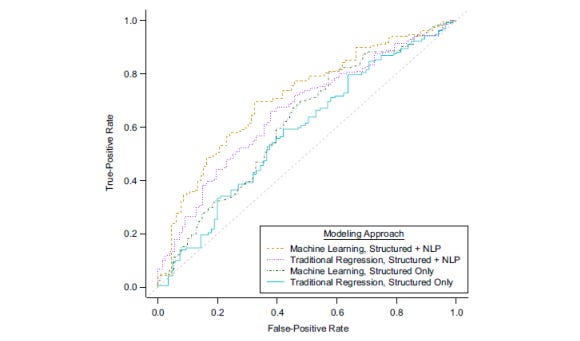 The NLP-enhanced models significantly outperformed structured data-only approaches. The best performing model achieved a cross-validated area under the curve (AUC) of 0.71 compared to 0.62 for structured data alone (Figure 3). At a classification threshold yielding 66% cross-validated sensitivity, the model achieved 79% cross-validated positive predictive value. This represents a substantial improvement over existing methods.