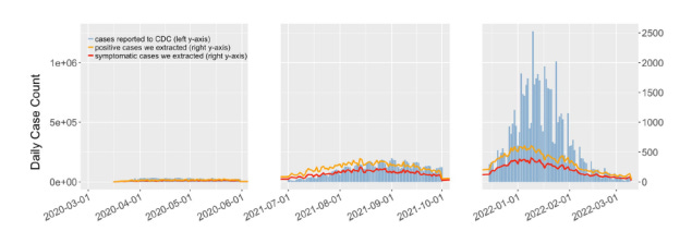 Figure 4. Daily trends in number of COVID-19 cases reported to the CDC and we extracted, for the
