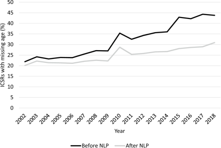 Figure 1. Percentage of FAERS ICSRs with missing age before and after NLP implementation. FAERS FDA Adverse Event Reporting System, ICSR individual case safety report, NLP natural language processing (Reprinted from (Pham P, 2021) under CC BY‑NC 4.0)